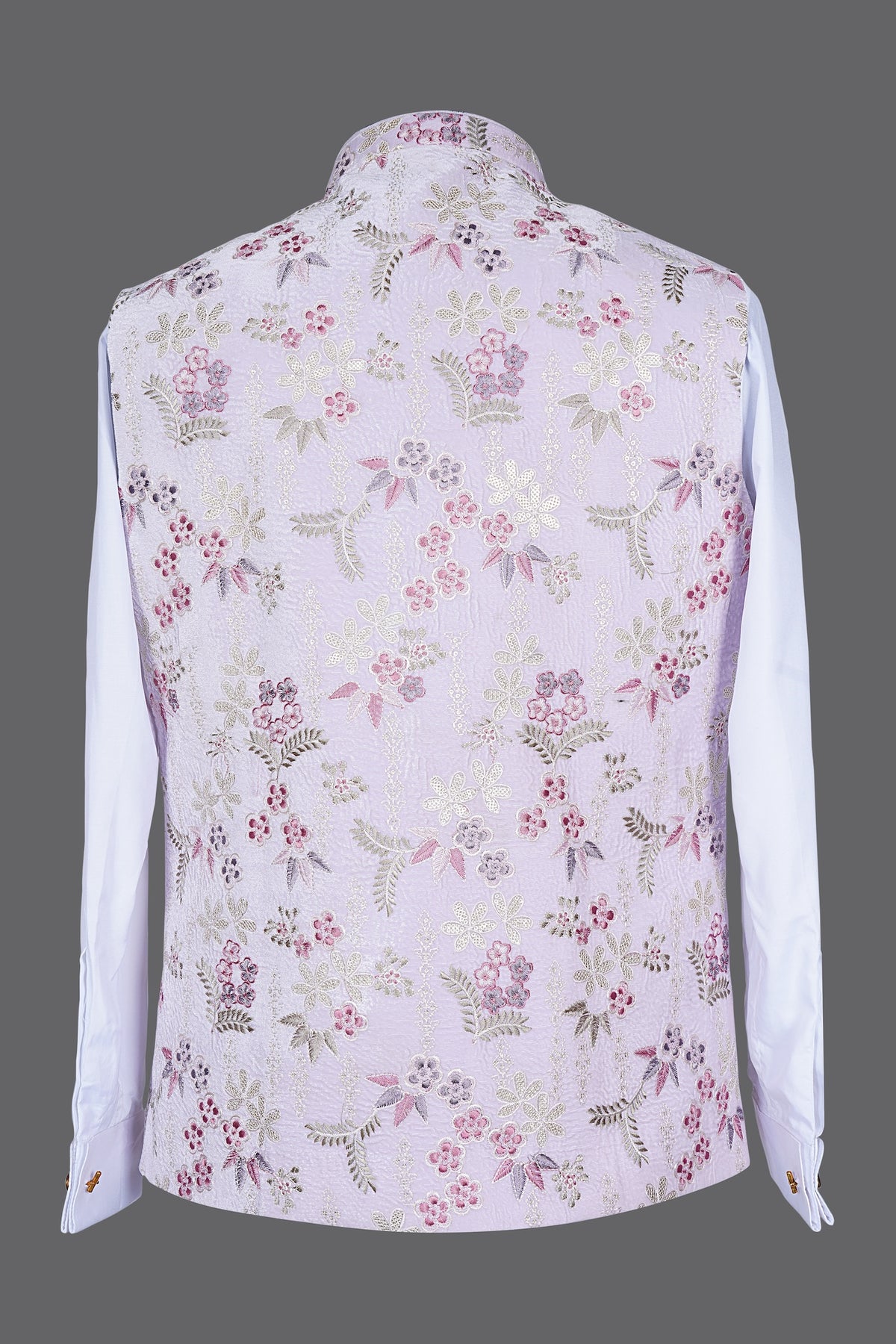 Embrace soft elegance with this lavender floral embroidered Nehru jacket for men. Featuring delicate multicolored floral motifs with gold accents on premium textured fabric, mandarin collar, button closure, and comfortable fit, this Modi waistcoat radiates romance. Perfect for weddings, mehendi, sangeet, Haldi, receptions, and festive occasions—pair with white/cream kurta for a charming, sophisticated ethnic look. Shop premium pastel ethnic wear now!