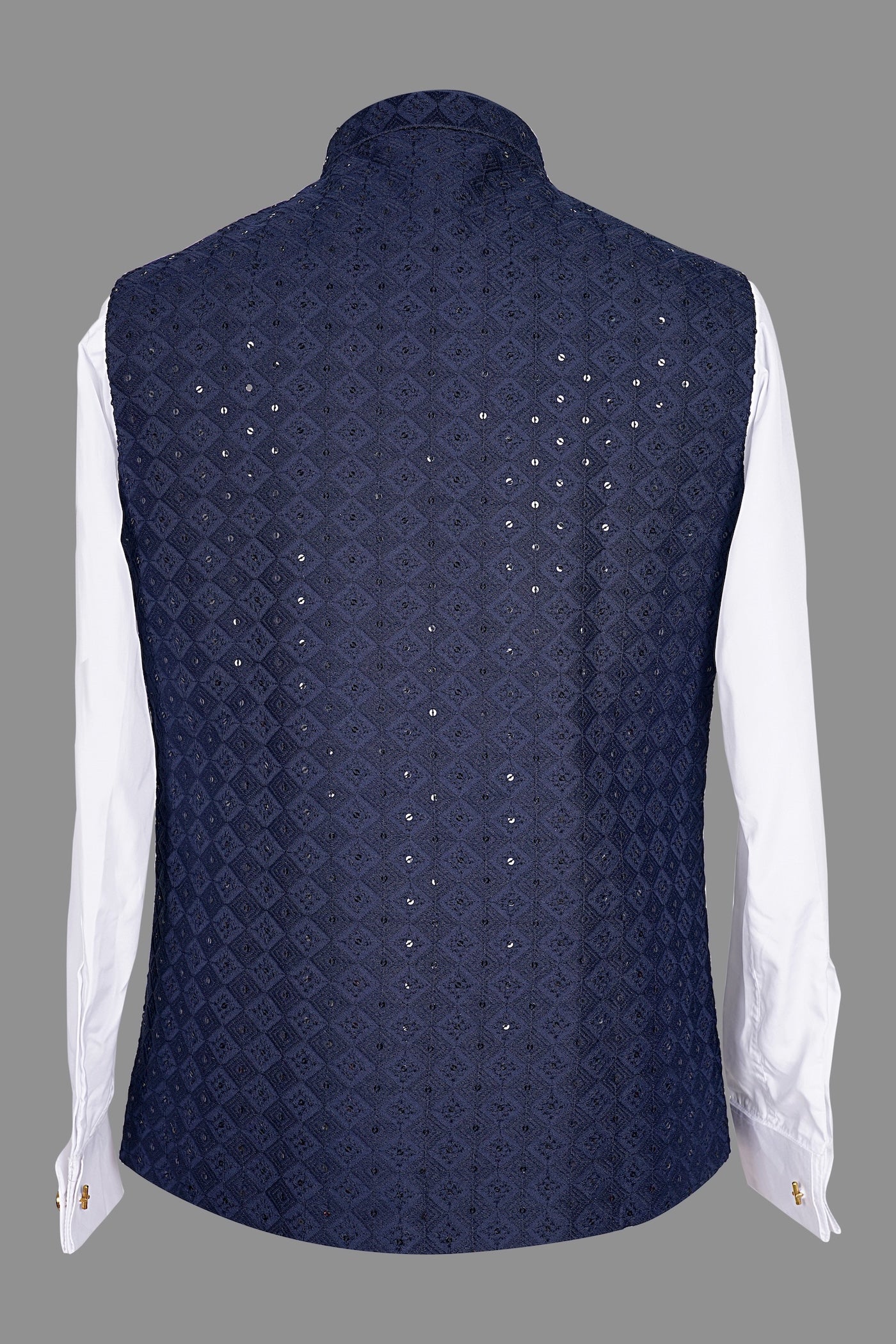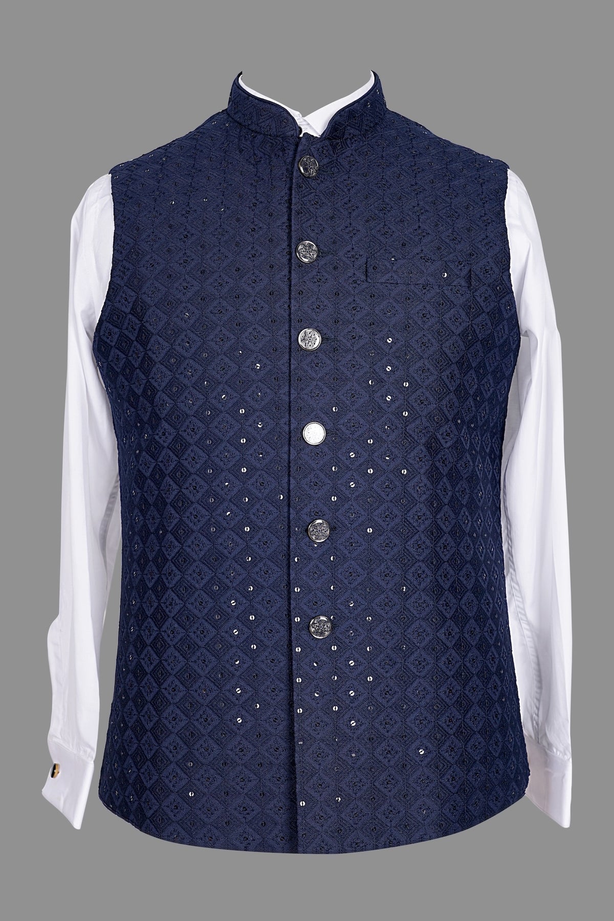 Shine at every celebration with this elegant men's navy blue Nehru jacket, adorned with delicate geometric embroidery and sparkling sequins/mirror work on premium textured fabric. Featuring a classic mandarin collar and sleek sleeveless design, this shimmering waistcoat is perfect for weddings, receptions, sangeet, groom looks, parties, or Indo-western outfits. Subtle yet eye-catching sparkle adds modern sophistication—pair with white kurta or shirt for a polished festive appearance. Luxurious, comfortable, and ideal for evening events—shop now for standout ethnic style!