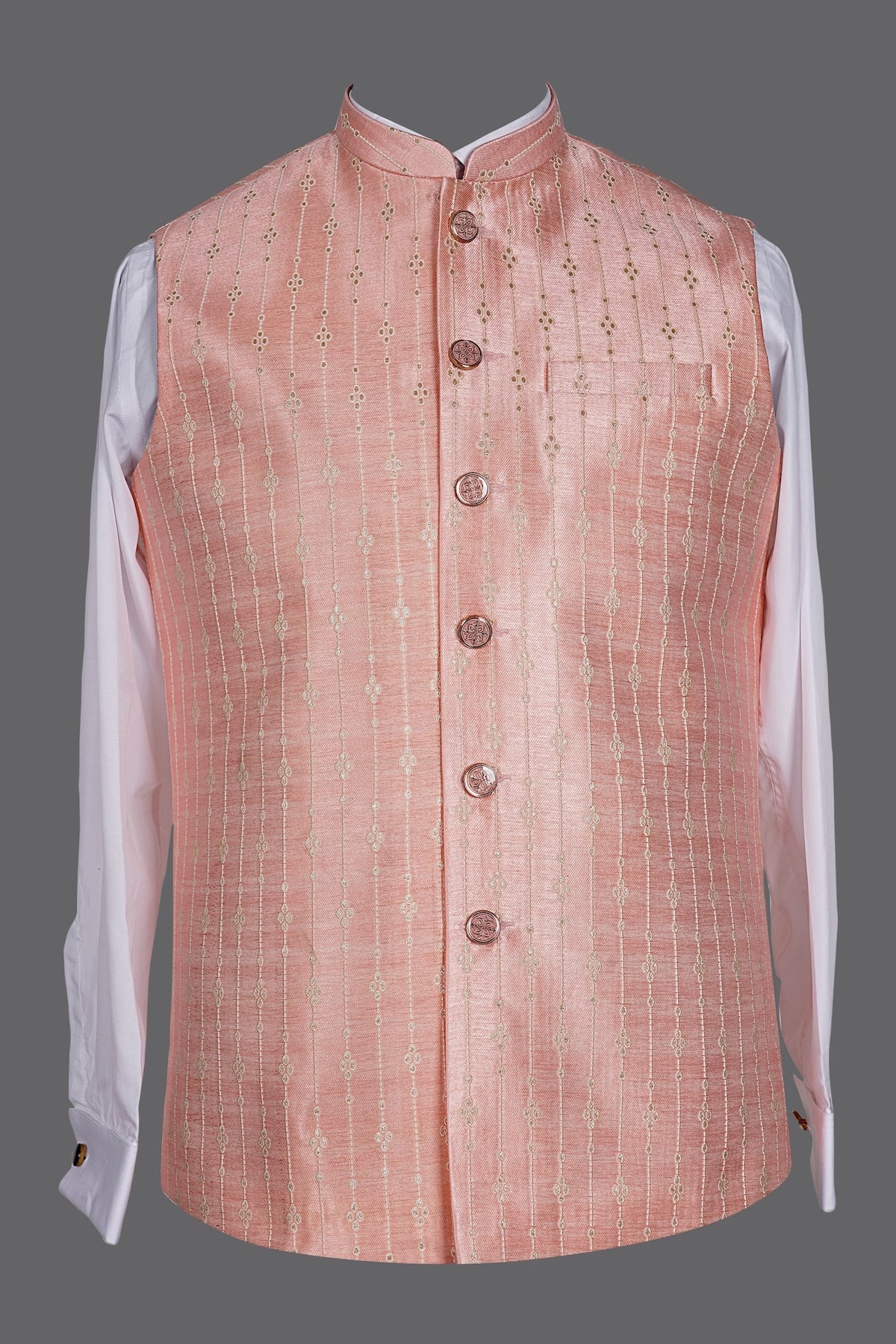 Elevate your ethnic style with this graceful men's peach pink Nehru jacket, featuring subtle vertical stripes and delicate gold motifs on luxurious lightweight fabric. The mandarin collar and soft shimmer create refined elegance — perfect for weddings, haldi ceremonies, mehendi, sangeet, receptions, or Indo-western outfits. Breathable and comfortable, pair with white/cream kurta-pajama for a fresh, sophisticated festive look. Ideal for grooms, groomsmen, or modern traditional celebrations in Nepal and India.