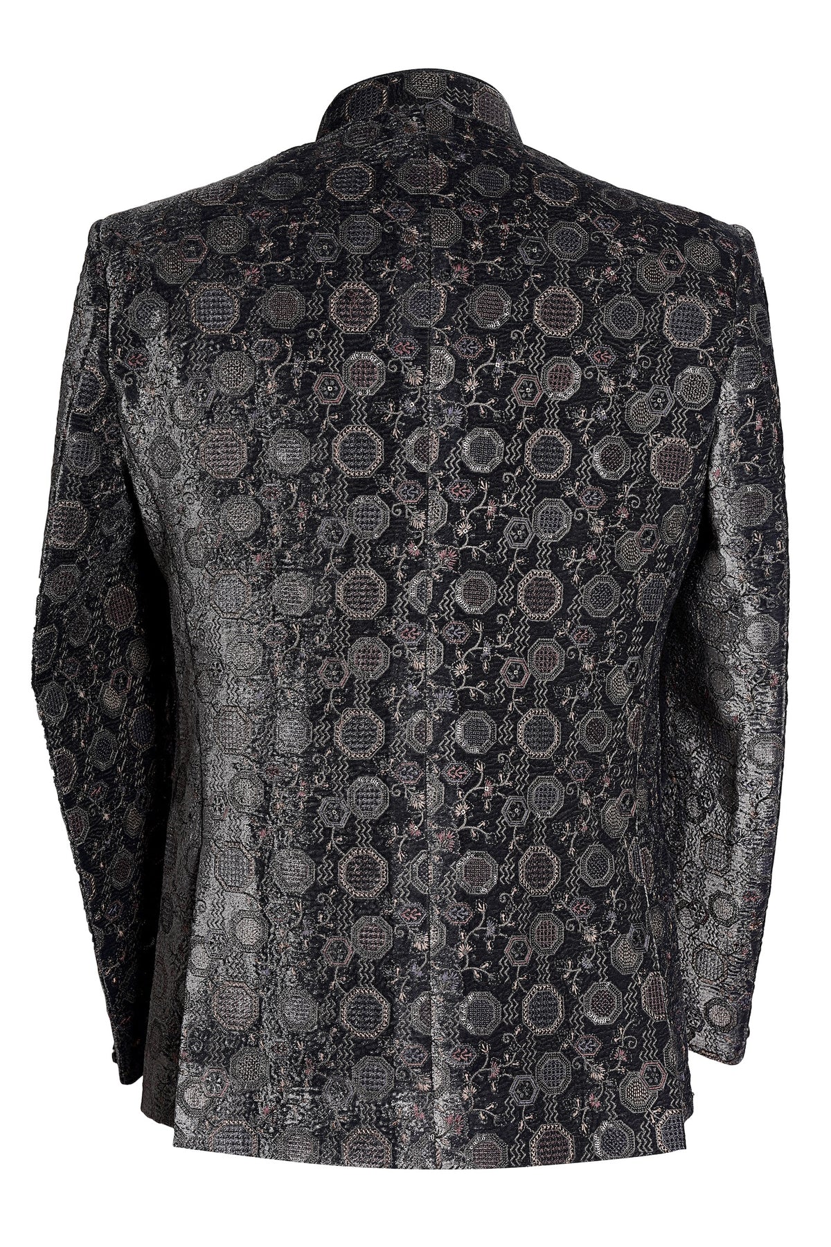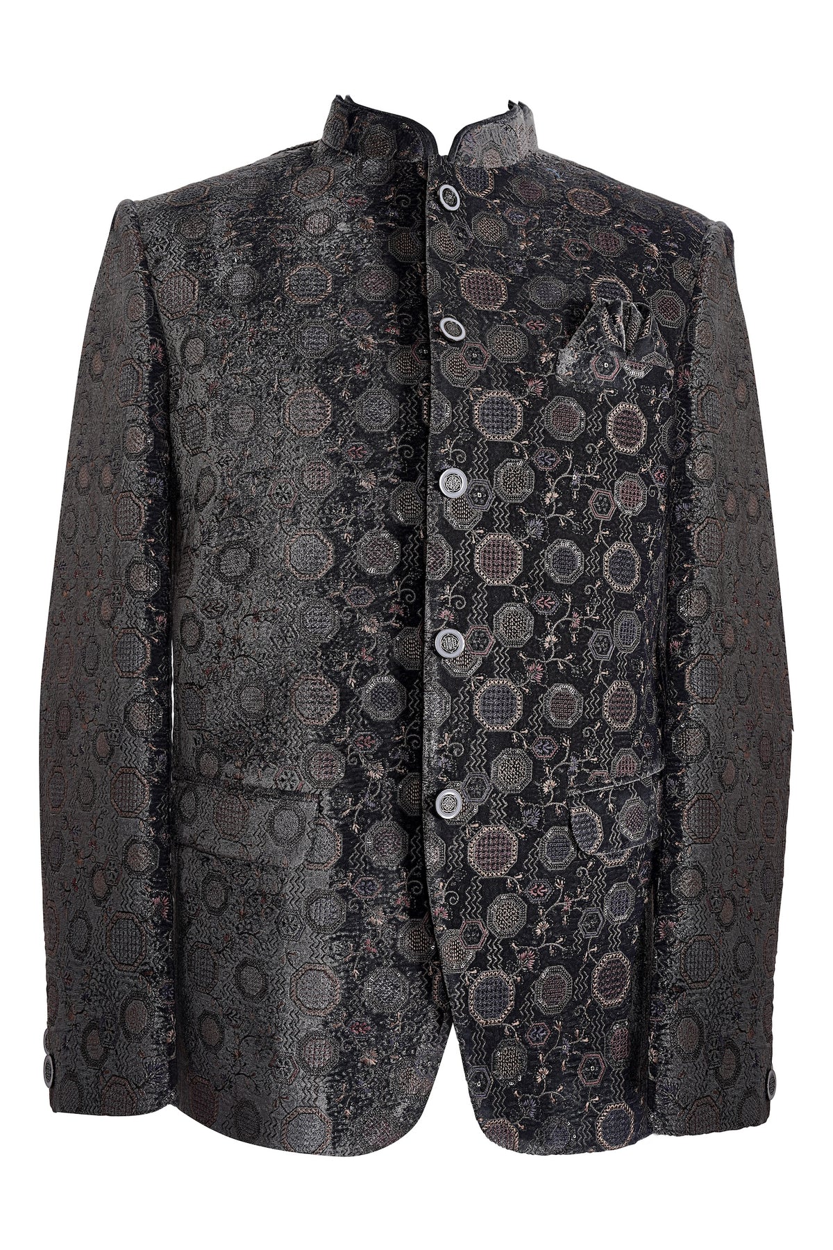 Exude regal sophistication in this luxurious black velvet geometric brocade Nehru jacket for men. Featuring intricate hexagonal honeycomb patterns with subtle floral zari accents on premium velvet, mandarin collar, structured shoulders, and pocket square detail. Perfect for weddings, receptions, sangeet, groom baraat, Diwali, and grand festive events—pair with kurta for timeless ethnic elegance. Shop premium black velvet ethnic wear now!