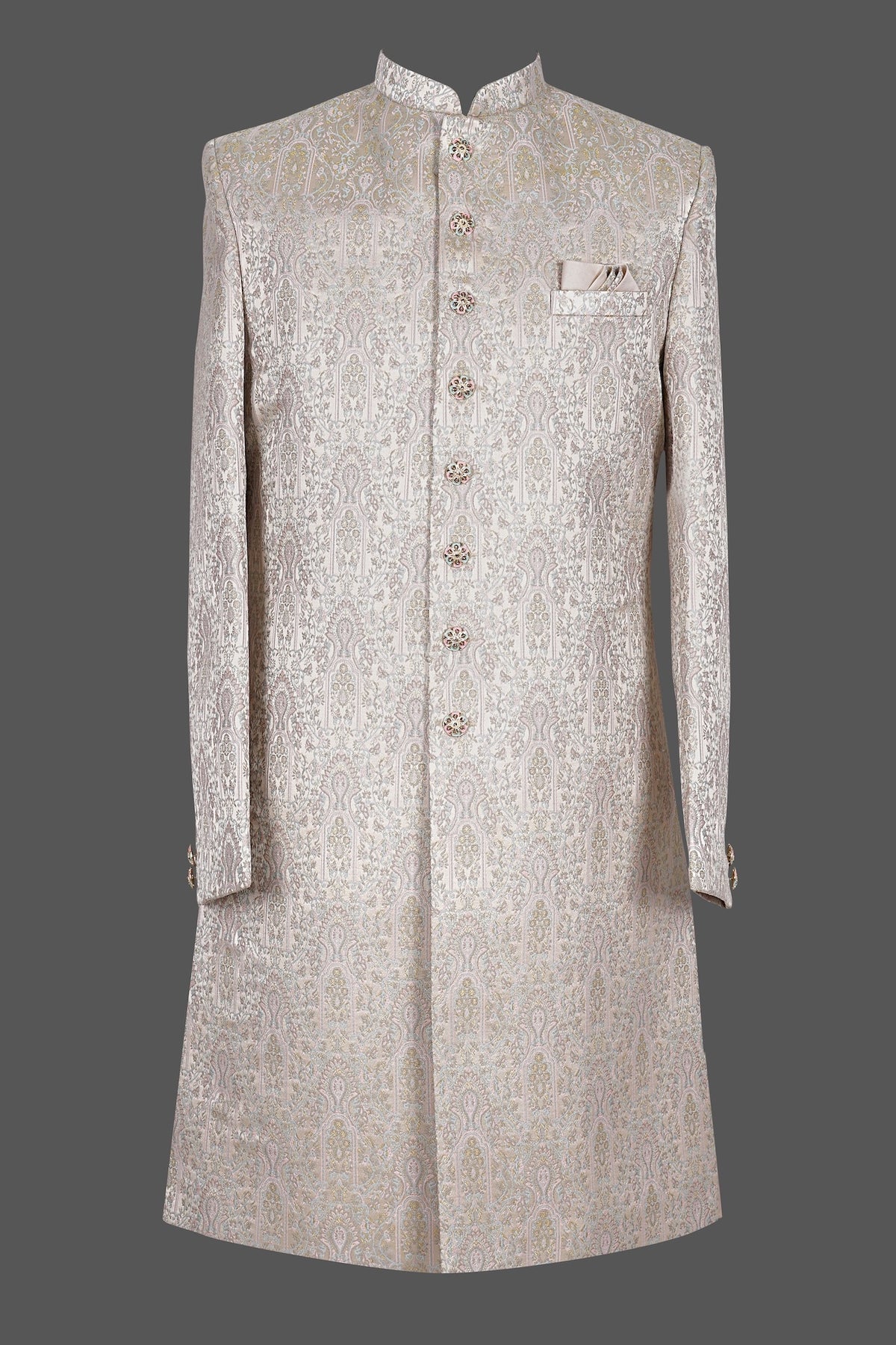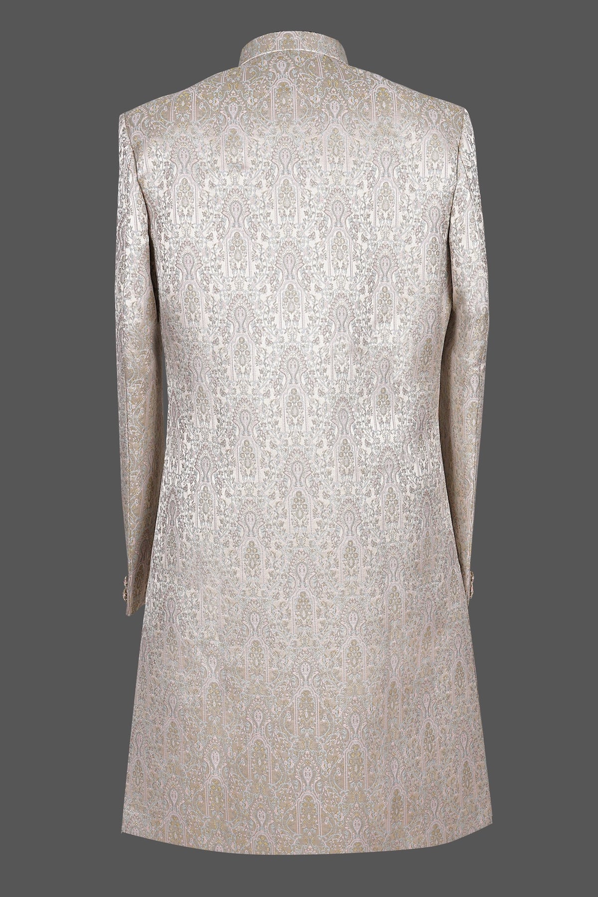 Luxurious ivory cream sherwani for men in rich brocade featuring intricate paisley and floral motifs with golden accents, mandarin collar, ornate buttons, pocket square detail, and elegant long coat style. Perfect for weddings, groom wear, receptions, baraat, sangeet, and grand traditional occasions. Premium handcrafted ethnic sherwani set for a sophisticated royal and regal look.