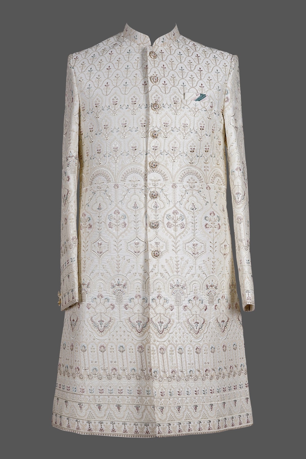 This exquisite ivory sherwani for men features intricate zari, pearl, and thread embroidery in elegant floral, paisley, and architectural motifs across the body and borders. With mandarin collar, ornate buttons, pocket square, and rich detailed hem—perfect for weddings, groom looks, receptions, or sangeet. Luxurious Indo-Western craftsmanship in premium silk-blend fabric. Shop now for timeless elegance!