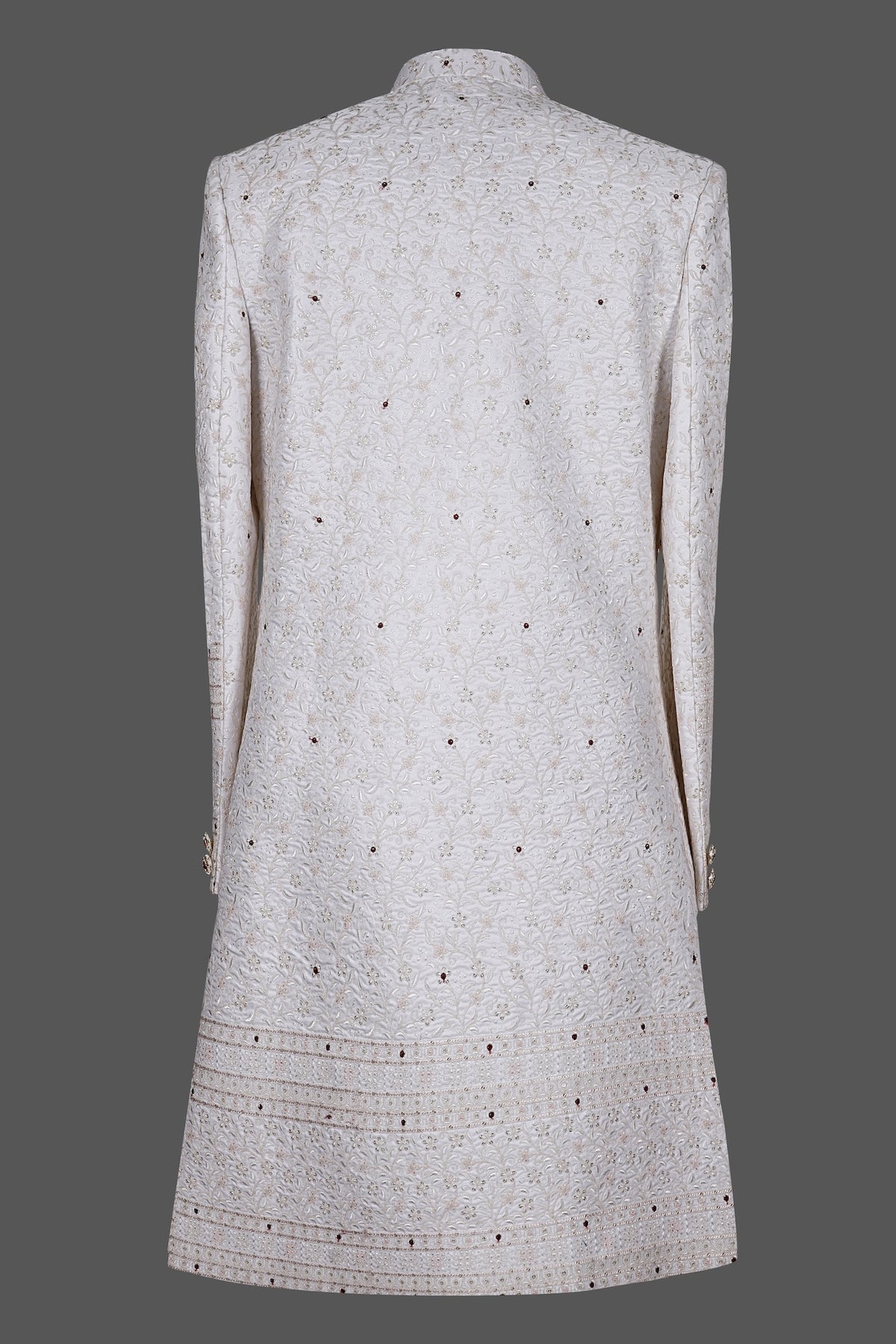 This luxurious ivory sherwani for men features delicate zari, pearl, and bead embroidery in intricate vine, floral, and leaf motifs all over, with ornate flower buttons and detailed border work at cuffs and hem. Mandarin collar, pocket square, and elegant longline silhouette—perfect for weddings, groom attire, receptions, or sangeet. Timeless Indo-Western sophistication in premium fabric. Shop now!