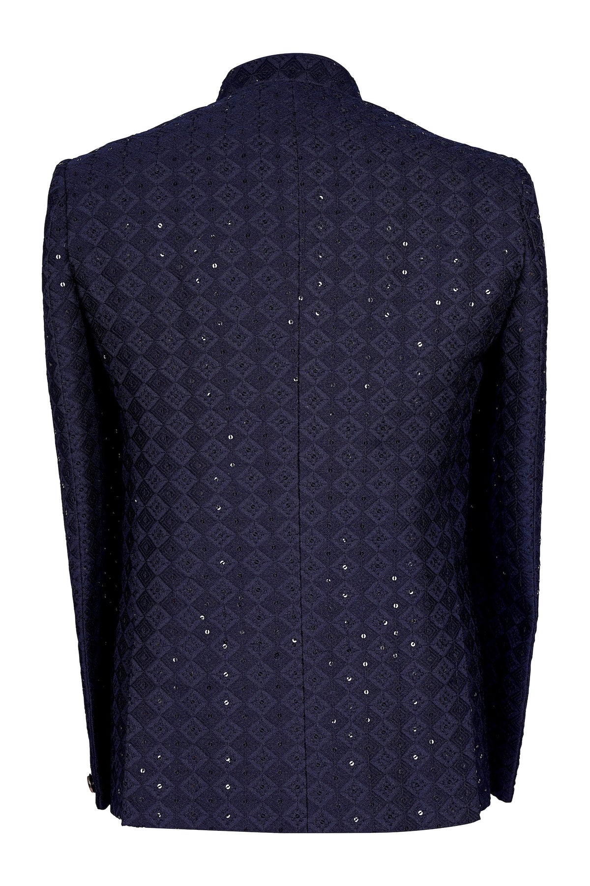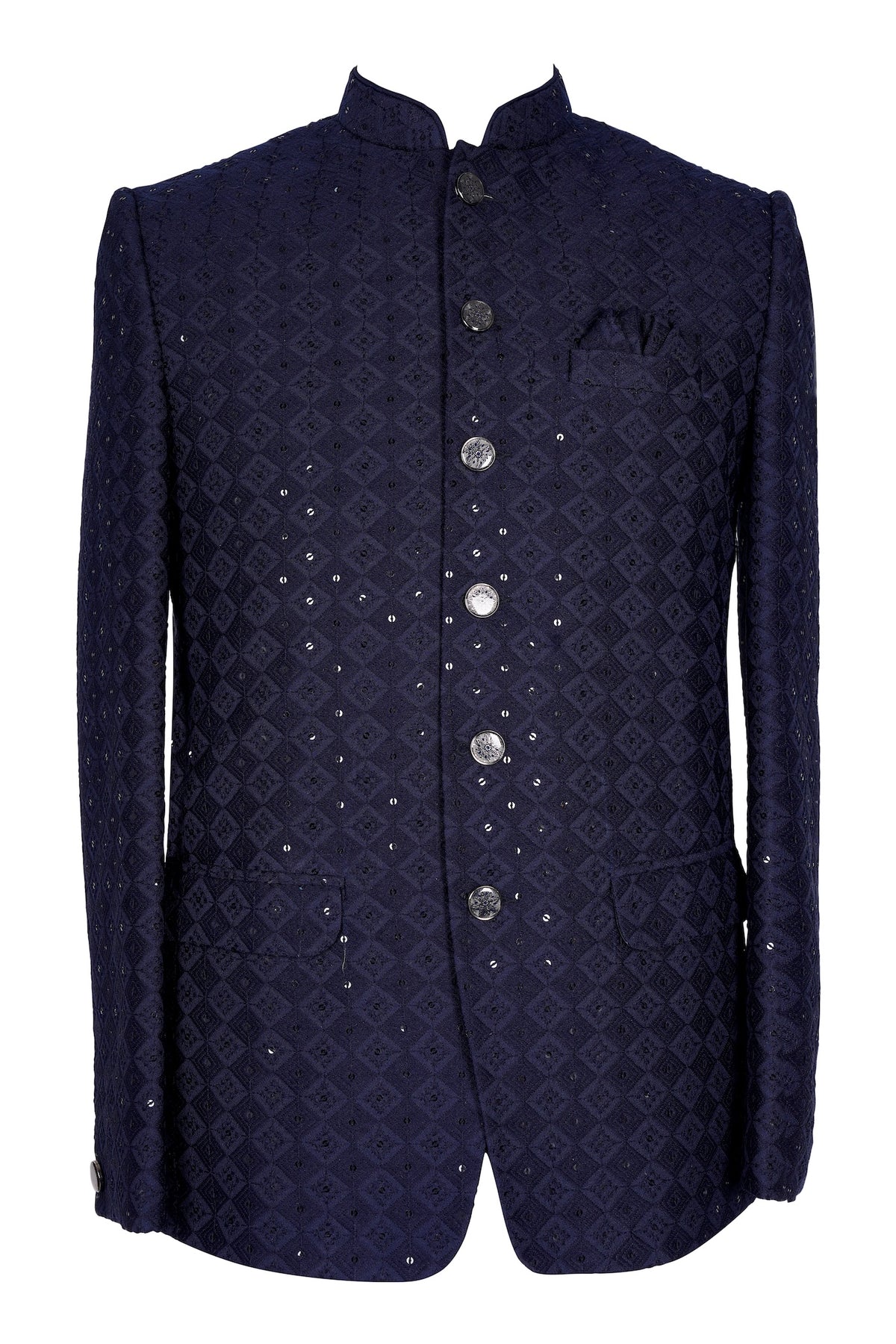 Shine with understated luxury in this navy blue velvet Nehru jacket featuring geometric diamond patterns and scattered sequins on premium textured velvet. Structured shoulders, mandarin collar, button closure, and pocket square detail. Ideal for weddings, receptions, sangeet, groom baraat, Diwali evenings, and grand festive events—pair with white/cream kurta for regal sophistication. Shop premium navy velvet ethnic wear now!