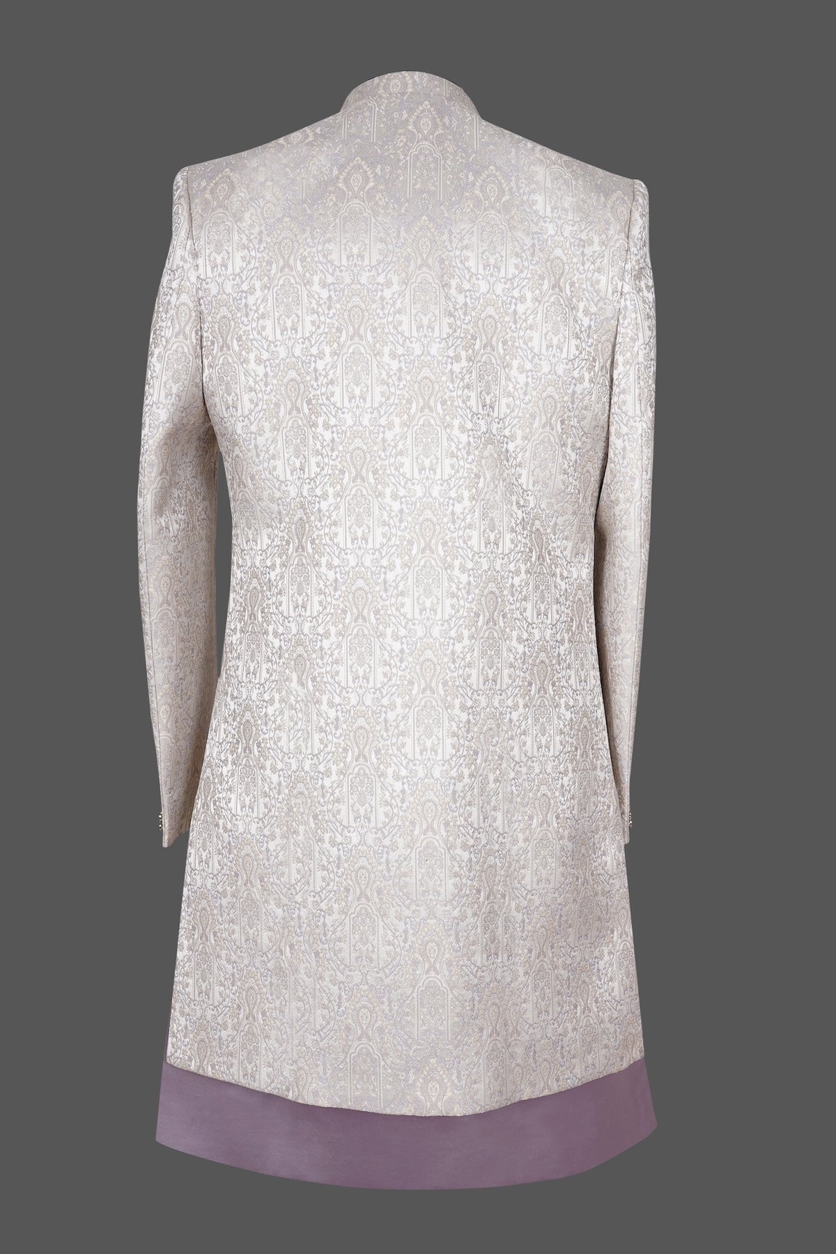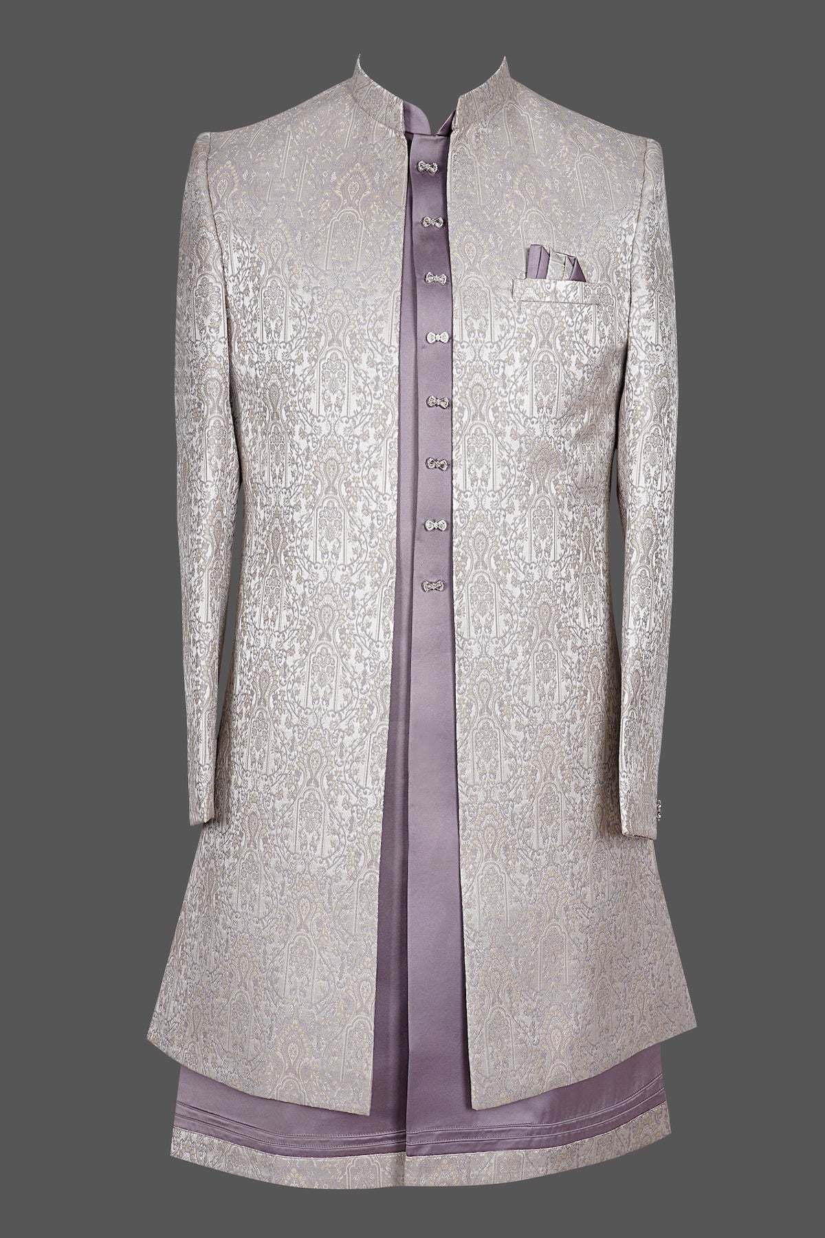 Luxurious silver grey sherwani for men featuring intricate paisley and floral brocade embroidery, mandarin collar, elegant purple satin placket with decorative buttons, pocket square detail, and matching purple kurta-churidar set. Perfect for weddings, groom wear, receptions, baraat, and grand traditional occasions. Premium handcrafted ethnic wear for a sophisticated royal look.